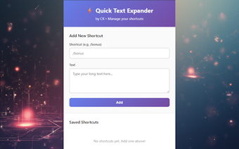 O Expansor de Texto Rápido por CK é uma extensão gratuita para o navegador Chrome que permite a criação de atalhos de texto que se transformam em textos mais longos instantaneamente. Com esta ferramenta, usuários podem economizar tempo e aumentar a eficiência ao digitar, substituindo sequências curtas por mensagens completas com um simples comando, como o exemplo de /bonus que se expande automaticamente para um texto predefinido. Esta funcionalidade é especialmente útil para quem precisa enviar mensagens repetitivas ou realizar tarefas que envolvem textos recorrentes.